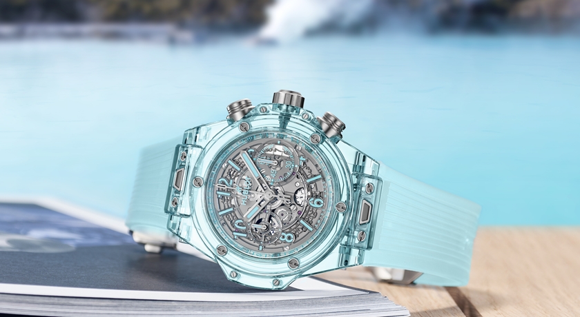 湖水藍設計靈感來自冰島著名地標「藍湖(Blue Lagoon)」,這款新色製程中屢遇挑戰,例如如何穩定培育無氣泡且色澤均勻一致的原料晶體、還有調配鐵與鈦的比例呈現完美的藍色調等,同時在嚴格紫外線測試下,維持高飽和度、色澤飽滿且能抗UV的特性。錶殼採用Hublot標誌性的「三明治」多層次結構,因為藍寶石材質的製作讓錶殼製成格外困難,需投入更多的工時進行生長冷卻、切割、拋光等程序,才能成就透明且色澤均勻的效果,同時透過嚴格品管逐一檢查刮痕、灰塵與色差,確保腕錶作品的完美。