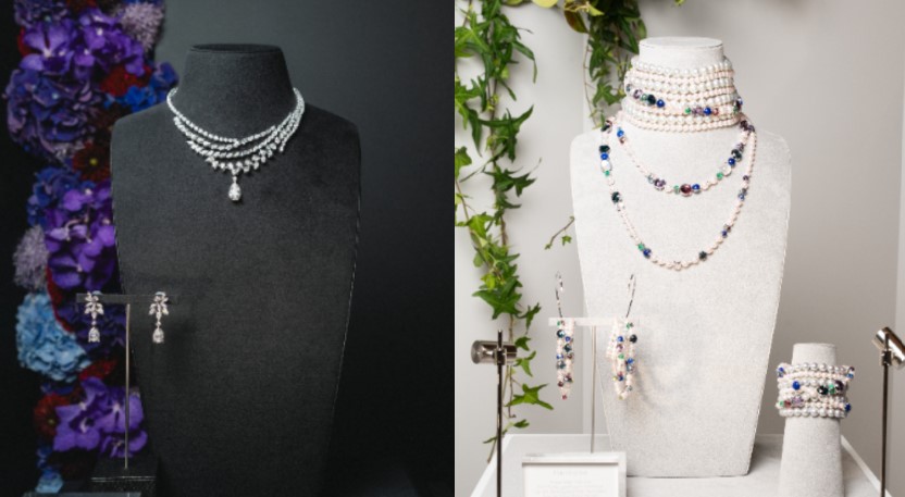 TASAKI HAUTE JOAILLERIE高級珠寶Symphonie de Lumière系列,雖是一片白色調,透過花式切割鑽石仍展現豐富變化,項鍊約26,584,800元、耳環約6,203,120元。