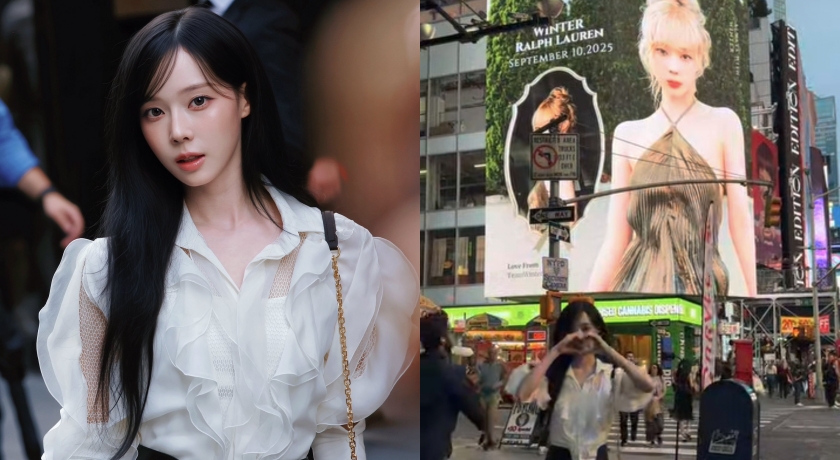 去年(2024)首度應RALPH LAUREN之邀參與時裝週時,Winter以淡金髮色搭配金色裸背洋裝,演繹雪國仙子,這回秀場周邊廣告牆更放上Winter當時看秀造型做預熱,讓她特地前往打卡。看得出Winter觀秀心情極佳,在廣告看板前比出愛心,用全新造型與上一回看秀的自己互別苗頭。
