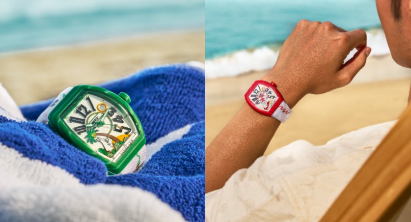 全新#FR2NCK MULLER Vanguard Beach限量系列腕錶,運用鮮明色彩呼應陽光、海灘與自由氛圍,錶殼採用玻璃纖維複合材質,透過攝氏1,500度高溫熔化玻璃染色壓製,展現高飽和色澤,同時兼具輕盈與堅固,為錶款帶來強悍抗衝擊的效果。錶盤布局也充滿驚喜,無論是陽傘下慵懶的兔子、衝浪板上的動感身影,或是熱帶叢林裡的探險姿態,皆宛如街頭塗鴉躍然其上。少見位於2點鐘位置的日期窗,也以趣味方式表現烈日高懸景象,與海灘設計思維更貼切。