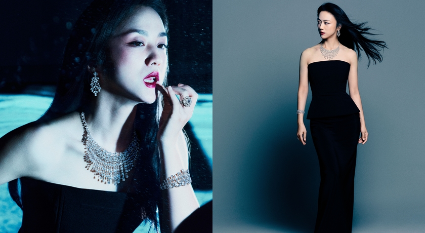 湯唯本次的封面造型共有四套,首先湯唯以俐落的黑色無肩禮服搭配De Beers Ellesmere Treasure高級珠寶鑽石項鍊,總重近49克拉,靈感源自北極冰雪的純淨意象,搭配同系列耳環與手環,盡顯高貴大器。第二套造型與風格轉入摩登氛圍,湯唯身著簡約剪裁的背心,搭配Phenomena Glacier七行鑽石手環與Portraits of Nature彩鑽蝴蝶戒指,利用層層疊疊的鑽石光芒呼應湯唯剛柔並濟的氣質。