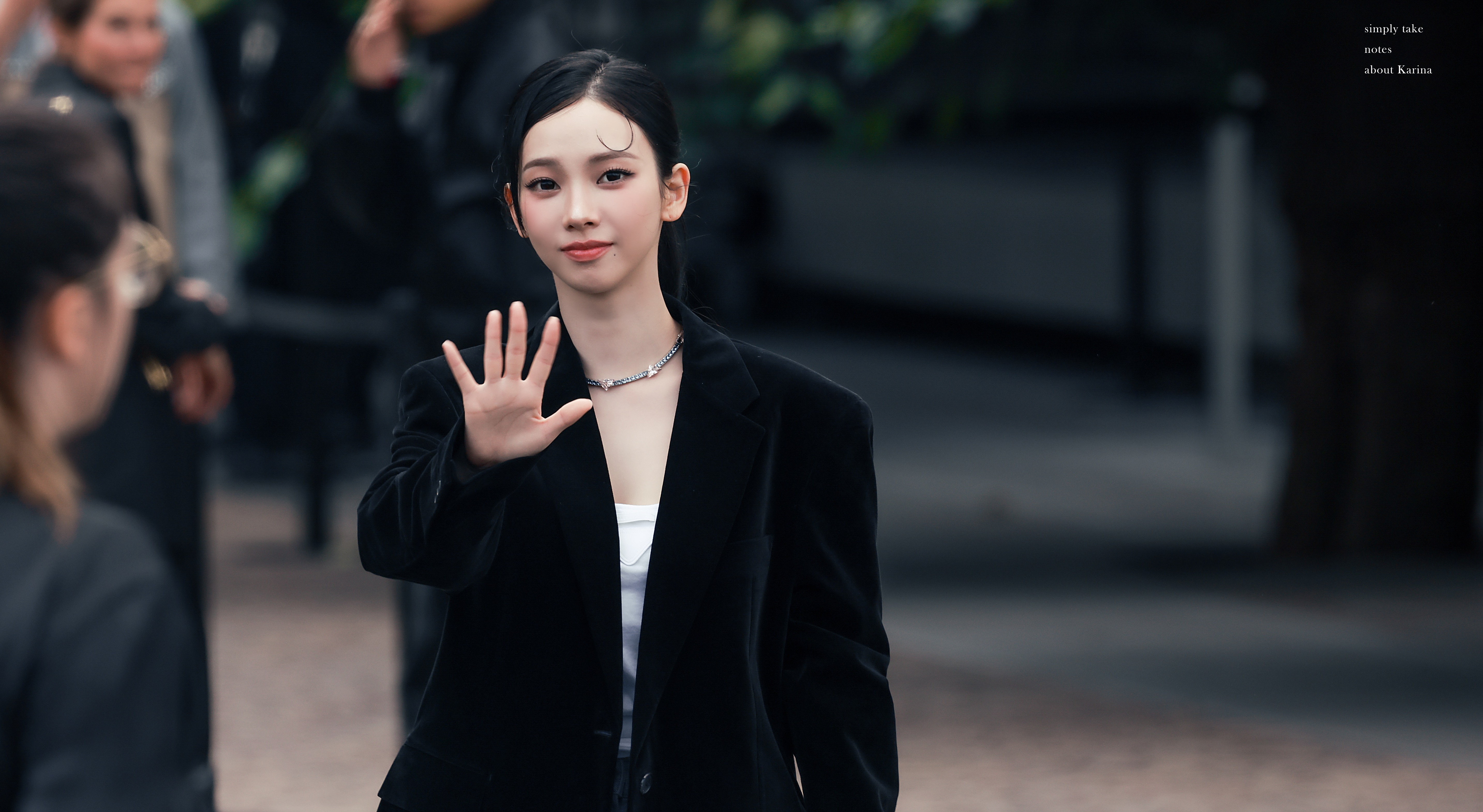 Karina現身秀場時以幹練風格現身,與機場時尚的學姐風差很大。