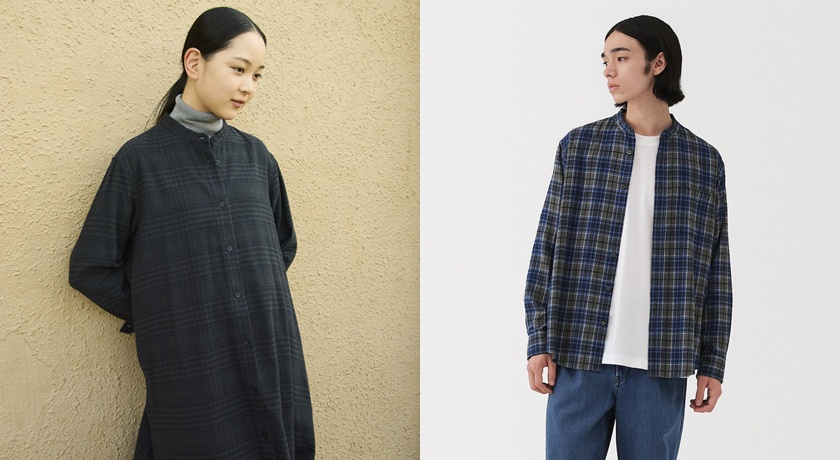 (左)女裝雙面起毛法蘭絨立領長袖洋裝,1,390元;(右)女雙面起毛法蘭絨標準領長袖襯衫,790元。(MUJI提供,以下同)
