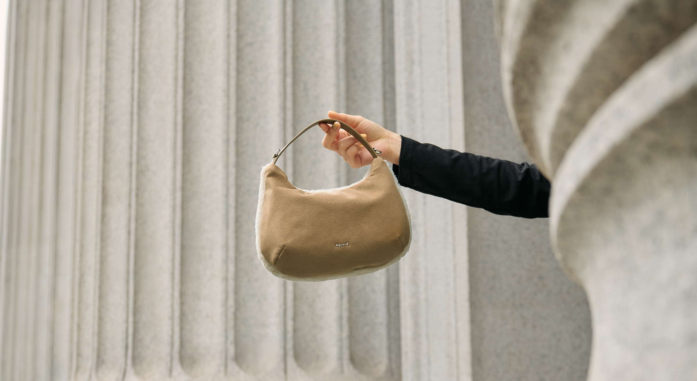 本季最受矚目的毛絨彎月包,採「雙面使用」的設計,增添多元搭配可能。其中一面以蓬鬆柔軟的毛料包覆經典半月造型,提供米白與焦糖棕兩款色選,背上就能營造冬季專屬的溫暖氛圍;另一面以絲絨材質呈現溫潤質感。包款配有可拆式長背帶,能肩背、斜揹自由轉換,實用度極高;蓬鬆外觀搭配低飽和色調,使日常穿搭多了些許法式輕柔感,是今年冬季必備暖萌單品。