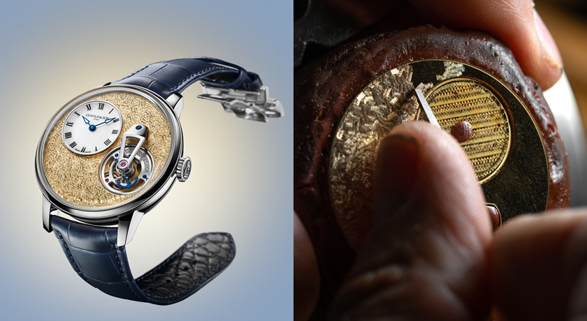 從主板到陀飛輪橋板皆以黃金或鍍金製作,搭配拉絲、倒角、鏡面拋光與緞面打磨等繁複修飾,呈現與早期陀飛輪裝置相呼應的古典風貌。更具意義的是,發條橋板上雕刻了一段獻詞,向John Arnold與Abraham-Louis Breguet之間惺惺相惜的歷史情誼致敬,讓此款限量11枚的腕錶不僅是藝術精品,更像是佩戴於腕上的歷史篇章。