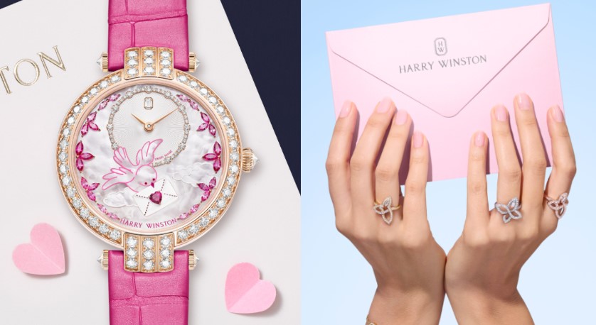 紐約精品海瑞溫斯頓(Harry Winston)自2016年起即以愛情為主題推出西洋情人節腕錶,透過珠寶工藝在錶盤打造浪漫風景。今年汲取飛鴿傳書為靈感,將白色珍珠母貝搭配紅寶石與粉色藍寶石,分別代表純潔、熱情和友誼,皆為愛情不可或缺的元素。