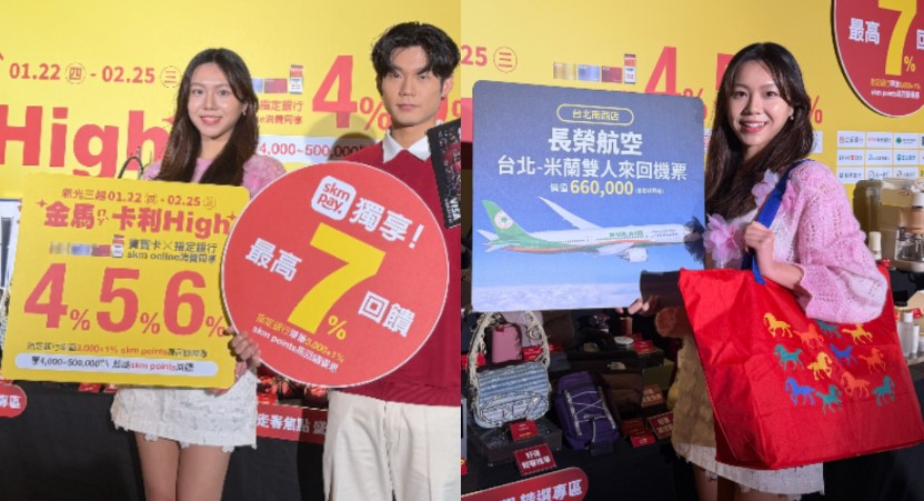 百貨龍頭新光三越為回饋卡友,攜手信用卡市場市占率超過8成的11大指定銀行推出《金馬卡利High》活動,1月22日至2月25日活動期間,祭出單卡累計消費滿1萬元回饋4%、滿6萬元回饋5%、滿30萬元回饋6% skm points,搭配行動支付skm pay消費任一筆達3,000元再加碼1%,最高回饋可達7%,此波優惠橫跨農曆新年和西洋情人節,不論辦年貨或買禮物,都是消費者最佳入手時機。