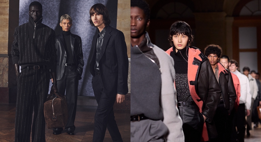 由男裝藝術總監Véronique Nichanian操刀的2026秋冬男裝系列,延續品牌一貫的從容步調,卻在細節中暗藏變化,可說是Véronique Nichanian執掌愛馬仕最後一舞的浪漫。設計核心聚焦於皮革與高級布料的交融,從全粒面小羊皮、輕量小牛皮到羊絨與羊毛混紡,材質在結構中自由切換,讓線條在俐落與柔韌之間取得平衡。輪廓看似簡潔,卻透過可轉化設計、雙面穿著與模組化細節,回應現代男性多場景的生活需求。色彩上以墨藍、泥炭、焦灰、卡其等沉穩色系為主,偶爾以橙色或亮色內裡作為點綴,為整體注入節奏感與幽默感。