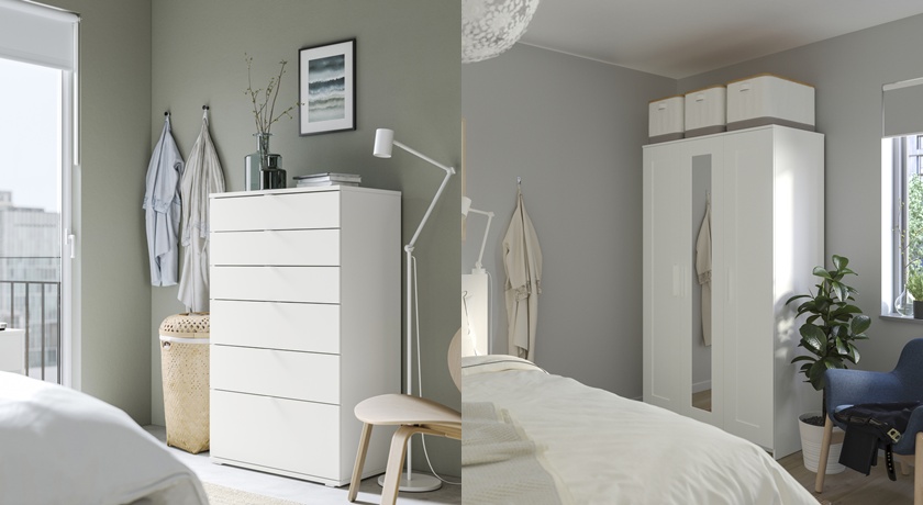 IKEA衣櫃銷售排名第一的是BRIMNES三門衣櫃,簡潔俐落的白色外型,輕鬆融入各種居家風格,附有可調式層板能依需求調整儲物空間,吊掛式的大衣也能輕鬆收納,成為不少家庭在年前進行衣物整理時的首選;能將雜物一秒收乾淨的收納櫃是小家庭必備,SKRUVBY附門收納櫃能遮蔽物品,讓空間視覺更清爽,內附可調式層板可依需求自由調整,VIHALS抽屜櫃有六個不同高度的抽屜設計,讓各類物品能依尺寸與用途清楚分類。