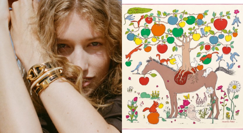 男士配件展現更鮮明的結構感與材質對比,珠寶大量運用皮革結合金屬,將馬韁革、鍍鈀或鍍金金屬組合為手環、項鍊與戒指,呈現剛柔並濟的風格走向,並呼應本季的航海主題。包款則著重大型旅行袋與後背包,延續愛馬仕製箱與馬具傳統,強調收納機能與耐用度,適合旅行或日常通勤使用。值得一提的是,本季絲巾藝術性尤為突出,從古典馬術、航海圖騰到當代插畫語彙,透過多位藝術家筆下重新演繹,讓絲巾不只是配件,更像是一件可穿戴的藝術作品。