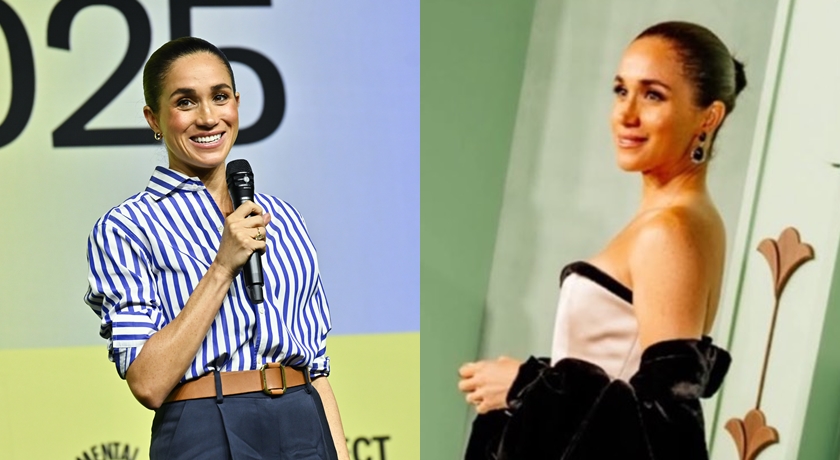 當晚梅根選穿的是由紐約奢華女裝品牌Harbison Studio為她量身打造的訂製禮服,設計出自創辦人兼設計師Charles Harbison之手。平口心形領口巧妙勾勒肩頸線條,貼身剪裁突顯修長比例,後方延展而出的黑色天鵝絨拖擺則為整體造型注入紅毯等級氣勢。她以低盤髮髻搭配垂墜式耳環,珠寶選擇低調卻不失存在感,與禮服線條相互呼應。腳踩同色系高跟鞋,整體造型在柔美與力量之間取得精準平衡。