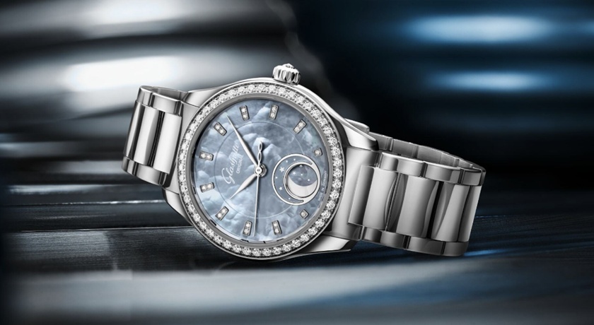格拉蘇蒂原創全新推出天際藍小夜曲月相腕錶,錶盤以超薄天際藍珍珠母貝打造,覆以多層深色漆面,突顯珍珠母貝本身的天然特性,在光線照射下,錶盤色調從淡雅銀藍漸變至深邃濃鬱的煙燻藍,宛如城市天際線的玻璃帷幕,從正面望去建築外觀幾乎呈現一致的藍色,當視線往上延伸、雲層倒映於玻璃,投射出層層光影,一如當代女性的多變魅力。