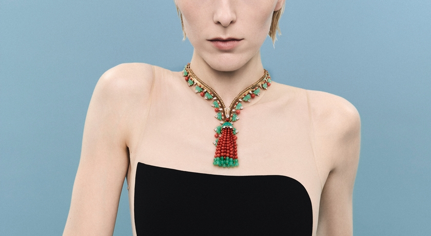 Van Cleef & Arpels珊瑚配綠玉髓及鑽石「Zip」項鍊、手鍊,可轉換佩戴形式,結合拉鍊結構設計與珠寶工藝,色彩鮮明。(Phillips提供)